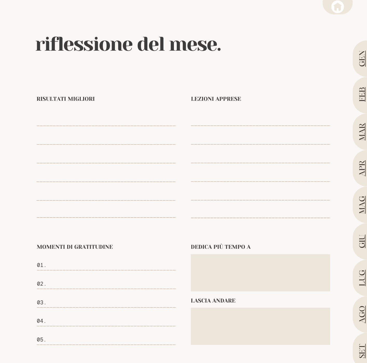 Pagine di gratitudine e review mensile ti invitano a fermarti, osservarti, migliorare.